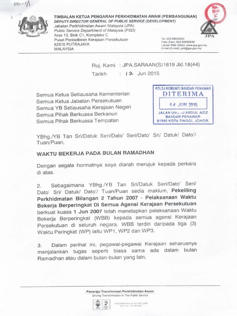 Pp bil042017 pekeliling penambahbaikan waktu bekerja berperingkat wbb di agensi. KERAJAAN MALAYSIA PEKELILING PERKHIDMATAN BILANGAN 2 TAHUN 2007 PELAKSANAAN WAKTU BEKERJA BERPERINGKAT DI SEMUA AGENSI KERAJAAN. Dalam jadual waktu bekerja berperingkat wbb dilaksanakan khas pada bulan ramadan melalui pemakaian surat.
